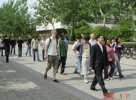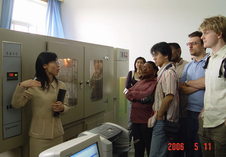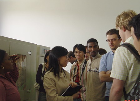 该硕士研究生班的员工对所参观的实验室表现出极大的兴趣。