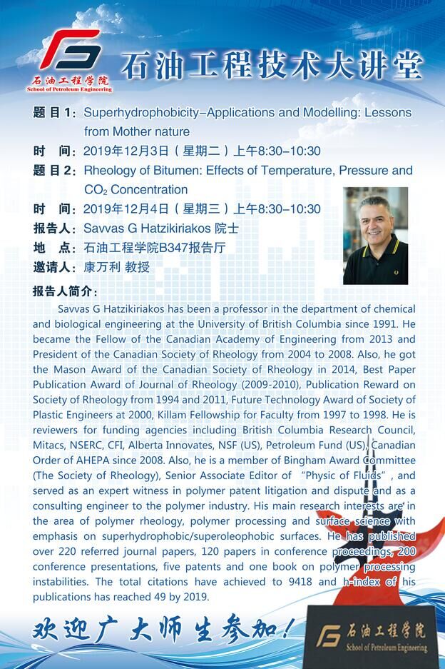 【石油工程技术大讲堂(第27期)】Savvas G Hatzikiriakos 院士学术报告