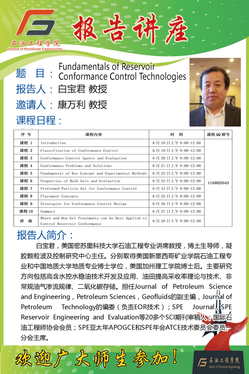 关于听取白宝君教授《油藏调剖技术》系列课程的通知