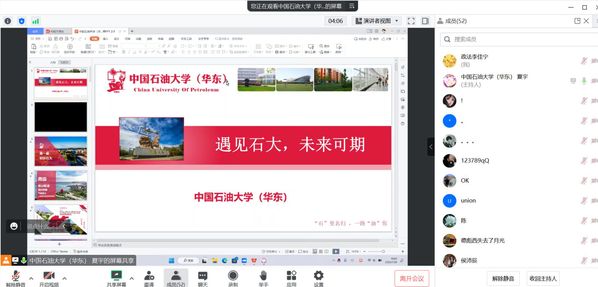 结合当前疫情防控形式,队员积极与母校相关人员进行对接,联合中国政法大学、吉林大学宣讲队组成高校联合宣讲团,利用钉钉、腾讯会议等平台,于126日对昌邑市文山中学进行了线上宣讲。宣讲活动由队长夏宇担任主讲,结合个人在石大的学习与生活体验,多角度对石大进行了讲解,积极为中学母校师生答疑。直播宣讲期间,公司共有二百余人在线观看,师生及家长反响热烈。通过线上宣讲,母校的优秀学弟学妹纷纷表示,今年将报考石大,圆自己名校梦,为公司和家庭争光。