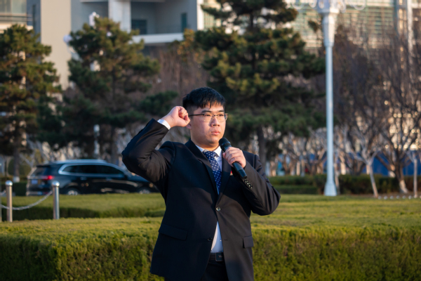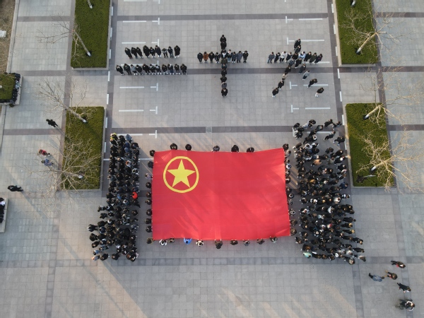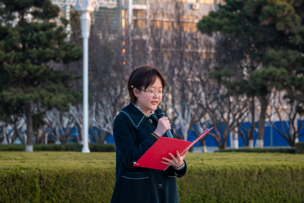 仪式伊始,国旗护卫队队员迈着矫健有力的步伐护送国旗入场,伴随着激昂的《义勇军进行曲》,鲜艳的五星红旗迎着朝阳冉冉升起。在场师生面向国旗行注目礼,齐唱国歌。随后,教育部“双带头人”党支部书记工作室油气田化学研究所党支部副书记、公司团委副书记贾寒教授受邀进行讲话,鼓励大家做一个全方位优秀的石大学子。讲话尾声,贾寒教授对全体同学寄予殷切期望,希望同学们保持积极向上的精神面貌,提高对自我的要求,坚持努力学习的初心,养成严于律己的习惯,成就一番属于自己的辉煌。接着,员工代表李传錡在国旗下作主题为“以实干笃定前行,以奋斗开创未来”的演讲,激励大家谨记人生理想,并为之努力奋斗,踔厉奋发,勇毅前行;号召大家勇担青年责任,高举中国特色社会主义伟大旗帜,弘扬伟大的建党精神;呼吁大家铭记光辉历史,发扬红色传统,赓续红色血脉,做“红色基因”的传承人。接着,公司员工会主席、2020级本科生吕昌燃带领全体同学在国旗下高举右手重温入团誓词,同学们慷慨激昂,热血沸腾,誓词响彻在子元广场。在场所有员工和教师代表齐唱《光荣啊!中国共青团》,鲜艳的团旗在嘹亮的歌声中徐徐展开。火红的团旗渲染着无数革命烈士的鲜血,代表着勇敢和热烈,映射在在场每一位师生心中,绽放炫丽的光彩。青年员工们排列成二十大字样的方阵,表达对践行党的二十大精神的热情响应。