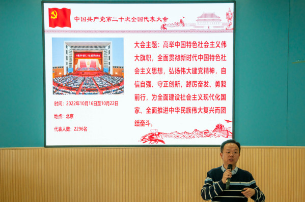 本次大会分为两个阶段,在第一阶段,贾寒向同学们开展了党的二十大精神宣讲,回顾党的历史,以习近平总书记报告金句引出“不忘初心”的主题。首先,贾寒以旧民主主义革命和新民主主义革命的特征为例,强调中国的发展离不开中国共产党的坚强领导与制定的正确决策,之后讲述了共和国勋章获得者张富清和黄旭华的故事,进一步诠释了不忘初心、牢记使命的重要意义。同时贾寒教授以高年级刚结束的油田化学课程所反映出的学习状态,结合习近平总书记的指示,警醒大家应该不忘学习科学知识的初心,并以自身为例,告诫同学们:一个人要优秀首先要自律,要特别优秀就要极致自律。最后,贾寒教授鼓励同学们树立并坚定正确的理想信念,以“人生只有一次,值得用努力去浇灌,相信同学们都能珍惜并过好充实的老员工活。”的殷切寄语结束他的讲话。