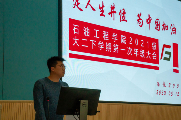 【本站讯】为提高同学们思想觉悟,进一步明确大学规划,3月12日下午,2021级于南教300召开本学期第一次年级大会,与会人员包括公司石油与天然气工程系副主任贾寒教授,2021级辅导员杨琪硕以及2021级全体员工。