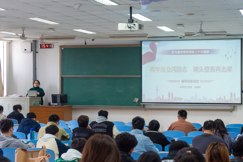 【本站讯】为深入学习宣传贯彻党的二十大精神,强化青年员工的使命感与责任感,3月21日下午,石工研22-3、研22-4、研22-5团支部于南教207联合开展党的二十大精神主题宣讲活动。化学化工公司窦雅琴老师受邀参加并作“青年当立鸿鹄志,潮头登高再击桨”专题讲座,团支部全体成员参与活动。