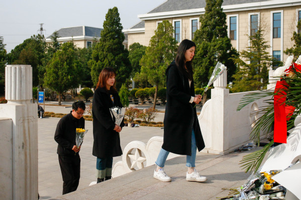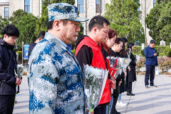 公司师生长江路街道办事处工作人员站立于革命烈士英雄纪念碑前默哀 王先祺摄