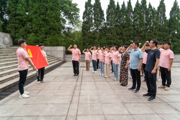 面对党旗,在博士团成员胡卓成带领下,博士团全体党员面对纪念碑庄严宣誓,重温入党誓词。