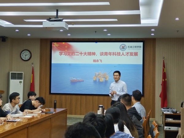 杨永飞老师首先从党的二十大报告的关键词入手,深入解读了党的二十大对科技事业的指导思想和前瞻性战略,强调了推进高等教育创新的重要性。他以目前油藏开发所用的众多模拟软件为例,生动表达了国家与科研工作者对于关键技术被“卡脖子”的被动与无奈。他表示油气产业作为我国能源行业的重要组成部分,不仅关系到国家经济发展以及国家能源安全,更关系到人民群众的切身利益。在当前国内外形势变化剧烈的情况下,油气产业的发展既受制于减排限产等政策的影响,也受制于市场供需关系的制约,因此,作为国家能源高校的青年人才,需要在党的指导下,始终坚定地站在国家的立场上,通过创新研发、提高自身的技能水平,推动我国油气产业向更高的水平迈进。随后,杨永飞老师又对个人未来发展以及青年科研工作者该怎么做进行了分析,嘱托每位党员在走上工作岗位后,要坚持目标导向、问题导向,做到有组织科研与自由探索科研有机结合,要真做科研、做真科研、真解决问题、解决真问题,要做有脊梁、有担当、有使命、有情怀的科技工作者。