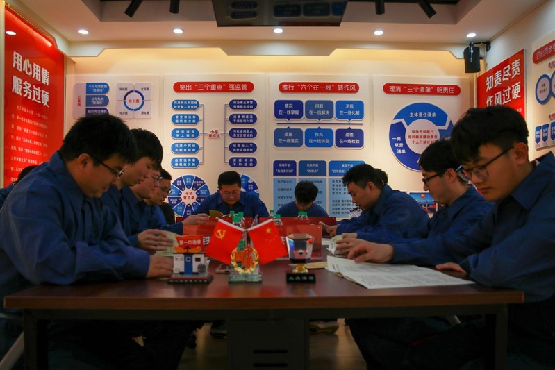 博士团成员在第二采油厂第一作业区党建工作室学习 蒋佰熹 摄