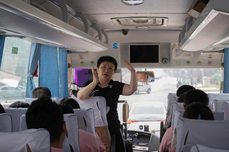 解晓燕在大巴车开展“随行小课堂”讲解石油精神 林雅瑜 摄