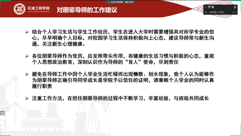 王静表示:“公司为每一个本科新生班级配备一名优秀的高年级员工担任朋辈导师,这是公司推进‘全员育人’的有益尝试,自2022年实施以来,朋辈导师们以阳光的心态、负责人的态度在朋辈教育、管理和引导方面发挥了积极作用,受到同学和老师的一致认可,希望这次交流能够帮助2023级朋辈导师更好地开展工作。”张家馨强调此次经验分享会充分发挥“传帮带”作用,助力各年级朋辈导师的成长,并对2023级朋辈导师提出四点期望,一是善于学习,担当责任,持续学习各项公司产品及管理制度;二是善于发现和把握新生成长的关键节点;三是善于引导,及时答疑解惑;四是善于沟通,在与专业老师、辅导员老师的充分交流中掌握朋辈导师工作要领。