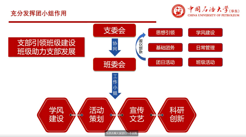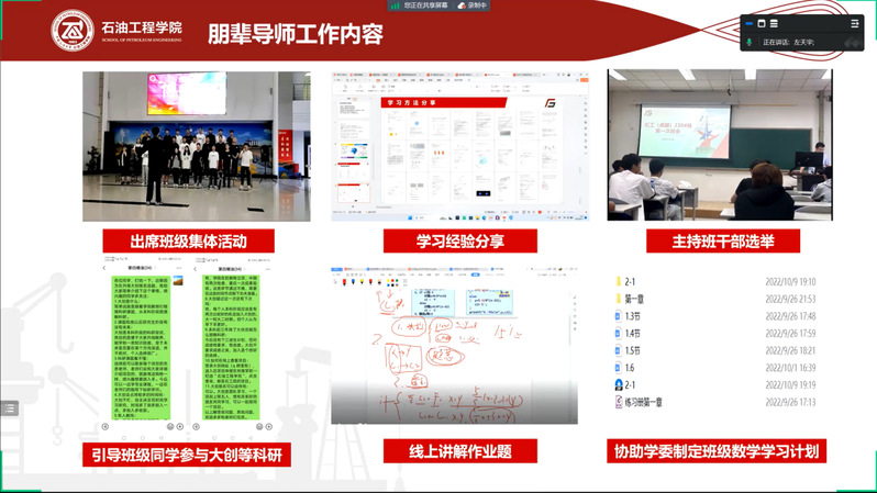 朋导互助,亦师亦友。2022级16名朋辈导师分享经验做法。他们依次分享了自己对朋辈导师的理解和工作实践心得,从学风建设、班团管理、校园生活、情感关怀等多个方面进行解读,并针对工作中可能出现的困难和挑战给予了建设性的建议。其中,李嘉昊强调工作中需要树立责任意识和榜样意识,认为陪伴”大于“指导”,“朋辈”也要兼具“导师”;柯灿分享了在学风建设上的经验做法,即紧抓关键少数、定点帮扶,营造氛围、全员提升;吕昌燃通过具体案例深入剖析了宿舍关系、心理健康等问题的解决思路;张欢以班级文体活动、志愿活动、双创工作举例,强调打造班级品牌特色的重要性。
