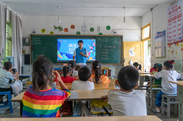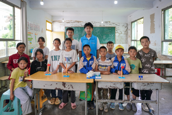 对于山里的孩子来说,支教队带来的是一些城里已不再新颖的教学方式,情景表演、视频问答、积木搭建……当谭煜洋带着“华龙一号”核电站模型的积木零件走进教室时,孩子们十分惊喜。在支教队员的带领下,孩子们齐心协力共同完成了积木搭建,还原了这项伟大工程。通过搭建活动,孩子们切身体会到建设这一奇迹工程的不易,进一步理解“两弹一星”精神,也深感到如今中国核工业的强大。