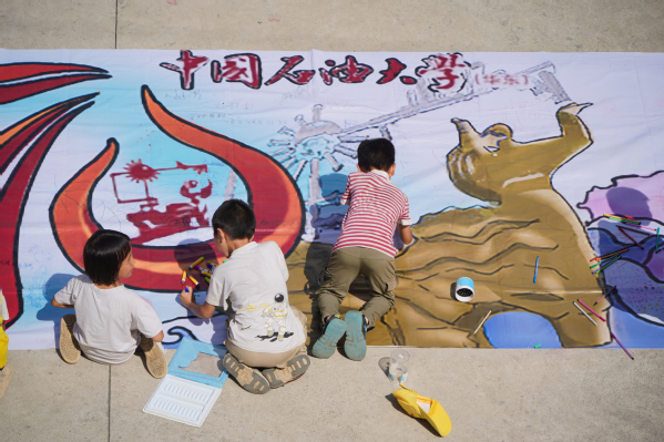 “哇,这个就是太阳女神吗?”为爱黔行支教队员带领着孩子们在长卷上绘出作为中国石油大学标志的创造太阳女神像。长卷共绘,是爱黔行支教队员们与革利公司的孩子献给中国石油大学70周年的一份礼物。支教队员带着革利小学的孩子们,手执画笔,以樱花与大海为灵感的图画占满了右侧的画纸,创造太阳女神像与七十周年庆的规定标志立于整个长卷的正中央,左侧有两位穿着革利公司校服的少先队员在敬礼,背景是代表着大山的绿色,石大精神的传承鲜活灵动跃然纸上。另外,在这幅长卷上也写满了孩子们祝福的寄语与爱国的话语,通过他们的小手传达内心最纯真的祝愿。