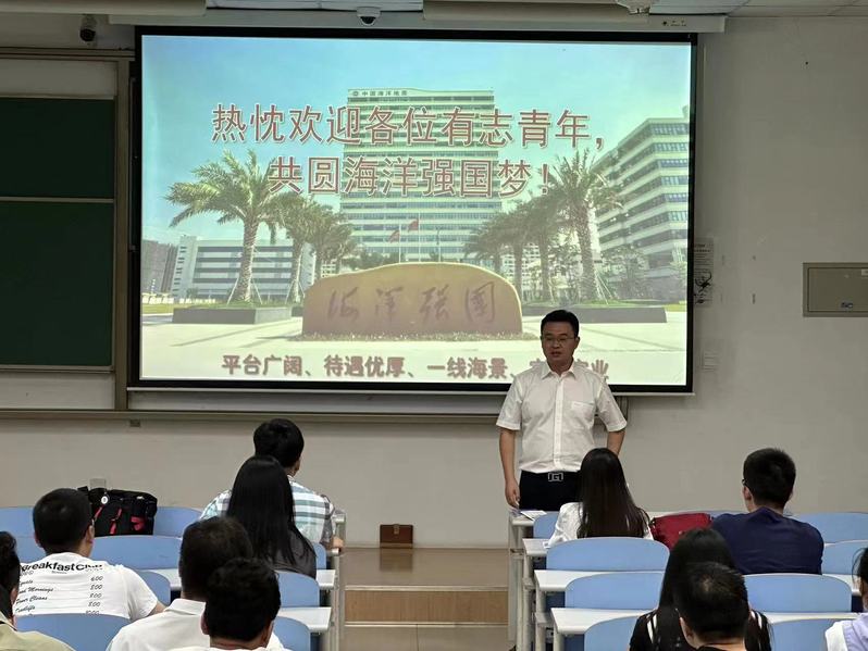 招聘会现场,广州海洋地质调查局人教处宋求精详细介绍了广州海洋地质调查局的工作环境、发展规划、招聘需求、薪资待遇等,帮助现场员工深入了解了其业务成果、创新平台、业务体系和人才政策等。随后,广州海洋地质调查局庞飞副局长表达了回到母校的喜悦之情,希望广大同学能够选择选择祖国最需要的地方,欢迎同学们加入广州海洋地质调查局共圆海洋强国梦。