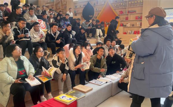 活动伊始,徐颖老师给同学们介绍了从古至今书籍的发展脉络,并以“有趣的书籍”这一主题围绕“有趣的结构、有趣的材料、有趣的内容、有趣的观看形式”这四个部分带领同学们探索书籍的奥秘。在同学们观赏徐颖老师提前准备的不同装帧类型的艺术品时,徐颖老师从视觉传达专业角度向同学们讲解了书的各种装帧形态、版式设计设计以及各类文学语言。另外,通过视频形式展示的无字书、虫子书、没有完整一页的书等不同风格的书籍形态,给同学们以视觉上的冲击和心灵上的震撼。老师借龙鳞装非遗传承人张晓栋的事迹呼吁同学们当从自己的兴趣出发,有目的性的探索和挖掘潜力将会事半功倍。在活动的最后,徐颖老师在现场展示了许多绝版书籍、绘本及个人创作,其中以图画形式或符号形式所呈现的作品为主。此次讲座引起了同学们的热烈讨论,同学们在讲座结束后自觉围绕在书籍旁观看和翻阅,并主动向老师请教,书籍中丰富多彩的艺术创作激发了不少同学对艺术设计的浓厚兴趣。