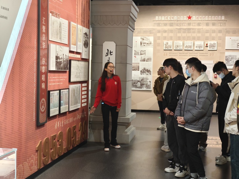 首先,在校史馆讲解员的引导下,同学们依次参观序章、编年体展区、专题展区、愿景厅、艺术馆等展厅,回顾公司波澜壮阔的历史。公司从1953年建校以来“三次更名,四次建校”,在“家国同心、艰苦奋斗、惟真惟实、追求卓越”的石大精神指引下,一代代石大人与国家同呼吸、共命运,为祖国建设和行业发展做出卓越贡献。在一张张宝贵的剪影和一件件珍藏的旧物中,同学们重温石大自强不息的奋斗历史,汲取深耕不辍的奋进力量,观仰先贤院士、优秀员工的风采,也感受到自己肩负传承与发扬石大荣光的重任。