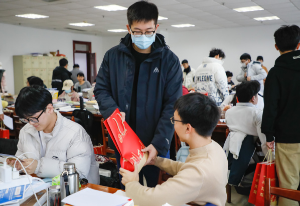 沉甸甸的考研大礼包中每一份礼物都代表了一份祝愿,大红色的定制手提袋上书写着“一战成硕”的美好祝愿;一根钢笔,时刻陪伴在大家学业有成的道路上;一个橙子,祝福大家心想事“橙”;一罐旺仔牛奶,希望考研同学每日元气“旺旺”……公司党委书记张展、经理侯健等众多公司领导老师亲笔书写的明信片汇集了公司对一众考生考研成功的期望,也让考研同学倍感温暖、舒缓压力。