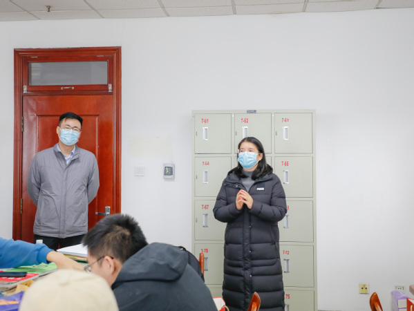 在发放礼包的过程中,王静、李昀泽、程然、王文辉等人与考生亲切交谈,关心员工备考状态。2020级辅导员李昀泽作动员讲话,他首先肯定了考研学子辛苦付出,之后他给同学们提出“坚定目标,坚持到底”“调节情绪,放平心态”“身体为本,劳逸结合”三点建议。考研重在坚持,在冲刺阶段要脚踏实地,不急不躁,备考的最后20天中,要学会释放情绪,保持愉快的精神面貌,注意饮食营养均衡,做好个人防护。最后他表示要相信时间不会辜负每一份努力,期待大家明年春暖花开时节捷报频传!随后王静、程然、王文辉也为考研学子加油鼓劲,祝福大家考研上岸。活动结束后,辅导员及各位代表安静走出研读区,各位考生也继续开始备考。