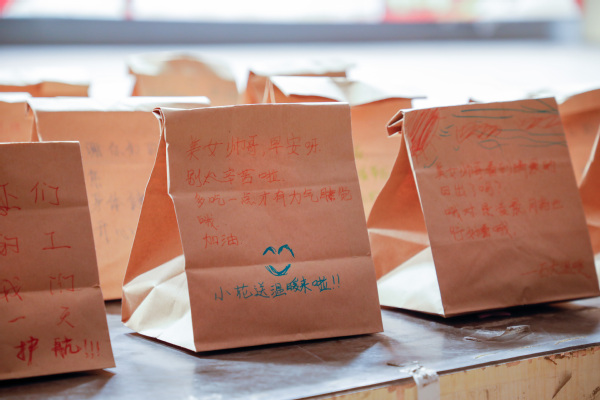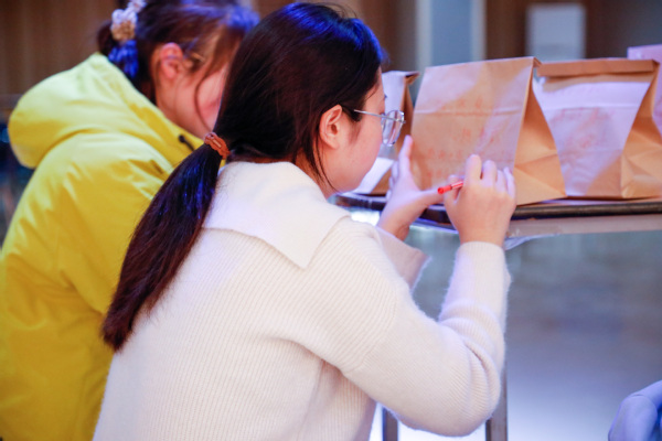 活动伊始,一场轻松愉快的破冰游戏迅速拉近了志愿者们之间的距离,大家欢声笑语,彼此间的情感迅速升温。紧接着,志愿者们齐心协力、分工明确,将面包、牛奶等美食精心装入袋子里,并在袋子上写下了真挚的祝福。虽然只是简短的言语,却如同初升的阳光,温暖而明亮,传递着志愿者们践行雷锋精神的坚定信念与无私奉献的温情。