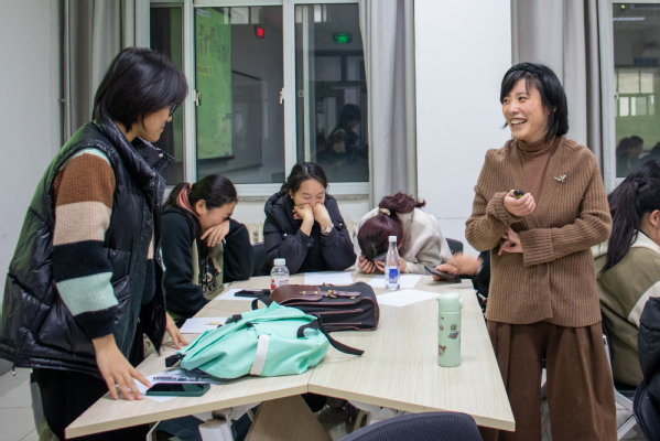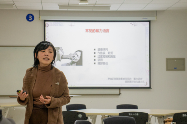 活动伊始,张老师通过“提问卷”“抽卡牌”的方式进行互动,让每位同学都能在轻松环境下表达自己对爱的态度和困惑,迅速活跃了现场气氛,随后张老师就正确的爱情观念与同学们作了分享,在情感旅程中,要找到自己真正需要什么,要在一段感情中有所收获,有所成长,并举例指出在爱情中存在的误区,顺势总结出轻启动、好体验、遇事解决得收获的口诀。她追古溯今地解释了“沟通”的定义,以非暴力沟通证明了“良好的关系是良好沟通的前提”,更是别出心裁地通过一场沟通小游戏,让大家意识到“看似同样的信息,却会被不同的理解”,认识到了沟通的重要性。