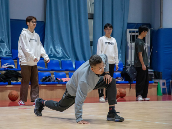 理论讲解之后,牟老师带着同学们进行了科学的热身,做好剧烈运动之前的热身,能够让运动员们做好心理和生理准备,提升运动表现,最大程度减少运动损伤。稳定的核心和脚步重心变换是篮球协调性的主导,在基本的热身活动结束后,牟老师进行了篮球专项脚步灵敏性与爆发性的无球教学,将启动、滑步、急停、跨步、转髋等脚步移动技术详细地向同学们展示,让同学们在球场上能够提升脚步上的优势,从而能够带来更多的得分机会和轻松投篮的机会。随后牟老师将同学们聚到一起,近距离展示了投篮时的各项技术要点,将前面学习的脚步训练与投篮训练相结合,进行模拟实战投篮的进阶训练,详细展示了跨步投篮、后撤步投篮等技术细节。在课程的最后,牟老师组织同学们进行了3v3篮球实战展示,讲解了一些在比赛中常见的战术。