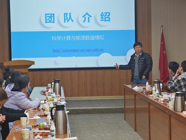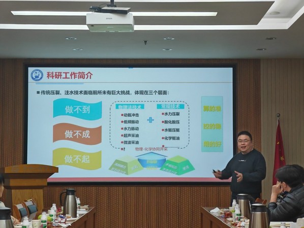 活动首先围绕“理工融汇共进、学科交叉赋能”的主题展开,吴飞鹏深入浅出的介绍了目前针对非常规油气资源开发,传统压裂、注水技术面临“做不到、做不成、做不起”三个层面的巨大挑战,并对物理波场开采技术的原理、方法、优势及难点进行了介绍;张建松介绍了科研过程中与油气开采数值模拟相关的数学建模和求解方法。随后,两个课题组开展了讨论交流,吴飞鹏勉励研究生在日常的工作生活中要细心认真,大处着眼、小处入手,善于发现问题,解决问题,并对自己的研究生阶段要有明确的方向和规划,做到大气做人、踏实做事、志存高远。郭会以一个优秀员工的例子,教导在场的研究生从事科研工作一定要脚踏实地、一步一个脚印,面对困难要多思考,不能轻言放弃。最后,两个课题组的研究生互相交流了自己在工作生活中的一些精彩瞬间、读研以来的一些感悟、经验以及对未来个人发展规划。
