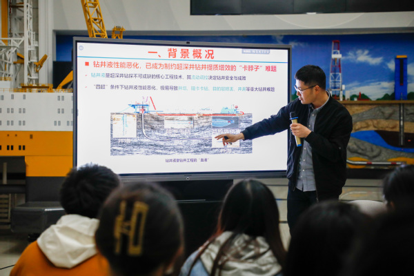 活动伊始,白英睿从团队成员、研究方向、科研平台与实验条件以及主要成果等方面介绍孙金声院士井筒工作液创新团队,并结合团队在钻井装备、钻头工艺、超高温钻井液和新材料研发,与同学们分享了团队参与超深井钻探工程的切身感受,体现了石大人的家国情怀、科技水平、创新能力和担当精神。