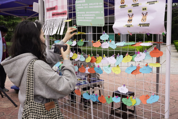 情绪的钥匙握在自己手中,参与者旋转写有不同情绪的转盘后,将贴纸贴在对应的情绪栏上,这是志愿者引导参与者寻找自己的钥匙,觉察情绪;参与者将写有基于第一站选择的情绪相关事情的云朵便签挂在展架上,想象在云海里被拥抱的感觉,这是参与者打开情绪之门,探索情绪;写有参与者联系方式的便签纸,静静的躺在盲盒中,等待下一位参与者将它拾起,成为参与者发送暖心短信的桥梁,这是参与者见字如面,提供情绪;最后,参与者撕下写有暖心语录的纸条,或留给自己,或留给他人,让爱心流淌,抚慰情绪。2023级本科生卢慧参加活动后说到:“我觉得今天的活动非常好,十分有意义,各种小活动在无形中帮助大家舒缓压力,释放了情绪,收获颇丰。”