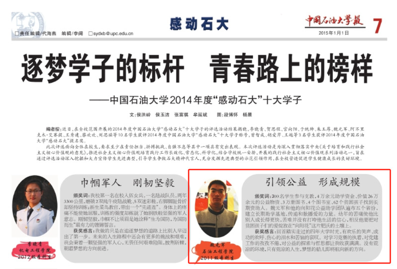魏元军2015年毕业于公司石油工程专业,作为一名心怀大爱的石工学子,魏元军在大学期间便积极投身公益事业。作为石大向阳花公益助学团队第一届队员和第二届队长,先后组织和奔赴山东平邑县、山西临县、云南大关县多地开展公益助学活动,传递和散播爱的力量。在校期间,魏元军先后获得集团首届“老员工自强之星”、2014年度“感动石大”十大学子、第二届“美丽心灵·阳光石大”十大人物等荣誉。