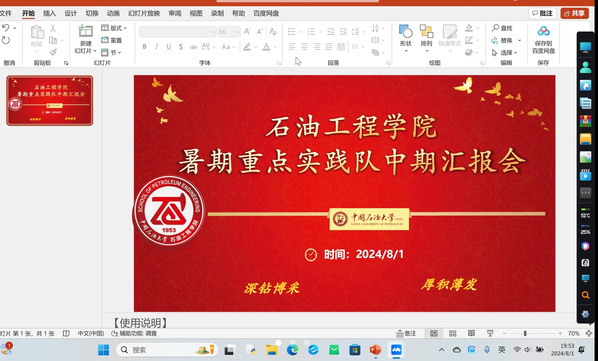 答辩环节中,画龙点“精”实践队致力于维护残疾儿童权益,助力残疾儿童健康成长。队长李承丰首先对实践队伍活动事项进行初步汇报,她说道:“目前实践队关注残疾儿童问题,已走进中小学、深入福利院,已大致完成实践既定目标,目前正准备宣传室工作。”针对实践活动中出现的人员工作安排、宣传力度不够等问题,张家馨提出细化工作内容,从目标出发,实事求是。同时重视宣传工作,扩展宣传视野,从而提升活动影响力。感碳石光实践队从双碳目标出发,针对各油田现状,进行深入调研。队长黄英首先对实践活动取得成果进行大致总结,对宣传情况进行总体汇报,同时针对活动中出现的人员分散、相关企业沟通联络等问题进行提问。徐新杰指出实践应落到实处,合理安排人员分工,通过联系指导老师等方式,进行活动的主题升华、以及人员企业的沟通交流。携笔强军实践队以当代老员工征兵意愿以及退役军人红色精神为主题,深入军营调研,走进抗战老兵,讲述红色故事,进一步宣扬红色精神。队长胡庆文从集中学习、问卷调查、参观采访、看望慰问4个方面总结了目前实践活动所取得的成果,并对下一步的宣传工作安排进行大致规划。南北油域实践队深耕油田保护创新主题,从长庆油田、胜利油田以及成都油气田进行深度调研,并针对油气泄漏等问题进行问题探究工作。队长卢雨对目前实践队实践进度进行总体汇报,她提出:“南北油域守护实践队的实践活动以调研为主,采访参观为辅。调查主题为石油方面的安全问题展开,目前正处于中期阶段,后续将陆续推出更多实践活动”。石榴花开实践队致力于民族团结主题,已初步完成实践任务,通过联合吉安公司进行交流合作,成效显著。红迹实践队坚持重走长征路,重温长征故事,目前实践活动大致完成,正致力于投稿宣传工作。自然之友实践队以自然为主题,成果聚焦城市以及乡村绿化问题,已形成多组航拍照片,在影像资料方面成果显著。寻秘淄博实践队从淄博爆火主题出发,针对琉璃、烧烤等一类文化底蕴主题,探寻淄博爆火密码,目前实践规划初步完成,正积极探索投稿途径。琉瑙之星实践队延续去年淄博主题,另辟蹊径,从齐国故都出发,挖掘文化底蕴,助力淄博持续长久爆火。匠魂寻心实践队探寻山东鲁笔,目前已大致完成实践计划,正不断打磨新闻稿和推文,争取更大平台的成果产出。科左后旗,碧野兴乡实践队致力于防沙治沙、红色文化、提高教育水平等多个主题从科左后旗该区域进行深入调研,目前工作正处于初步阶段,后续预计成效显著。