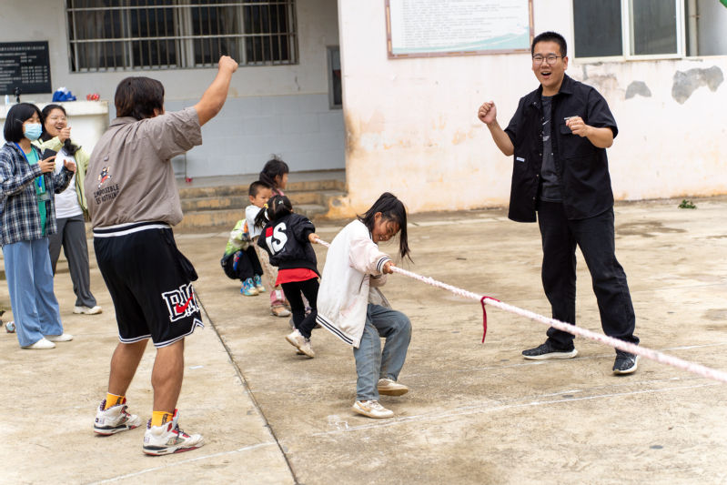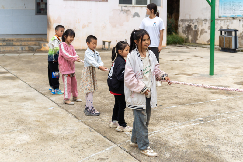 随着清晨第一缕阳光的洒落,龙井小学的操场上热闹非凡,孩子们身着统一的服装,脸上洋溢着兴奋与期待的笑容。望曦队的志愿者们精心策划了包括拔河、摸石头过桥、两人三足、丢沙包、跳大绳、无敌风火轮、吹乒乓球、夹乒乓球等在内的多项趣味运动项目,旨在通过团队合作与个人挑战相结合的方式,激发孩子们的潜能,增进彼此间的友谊。