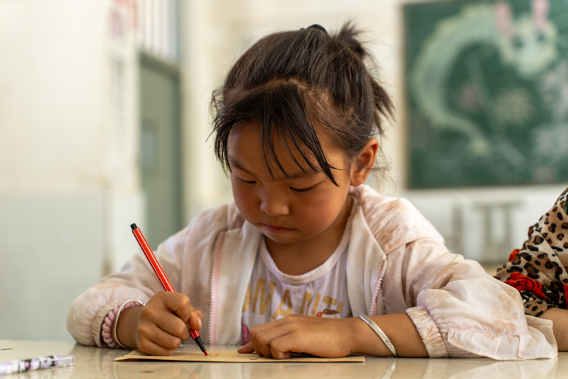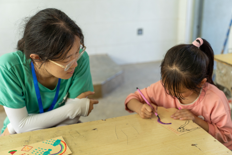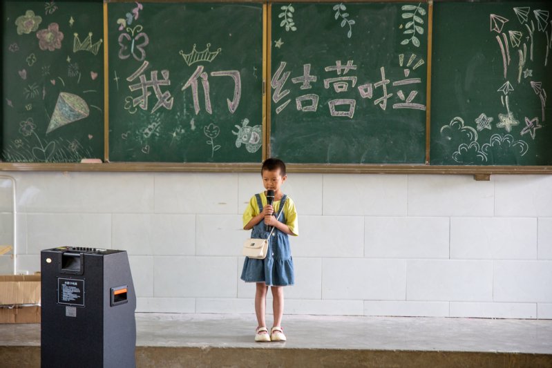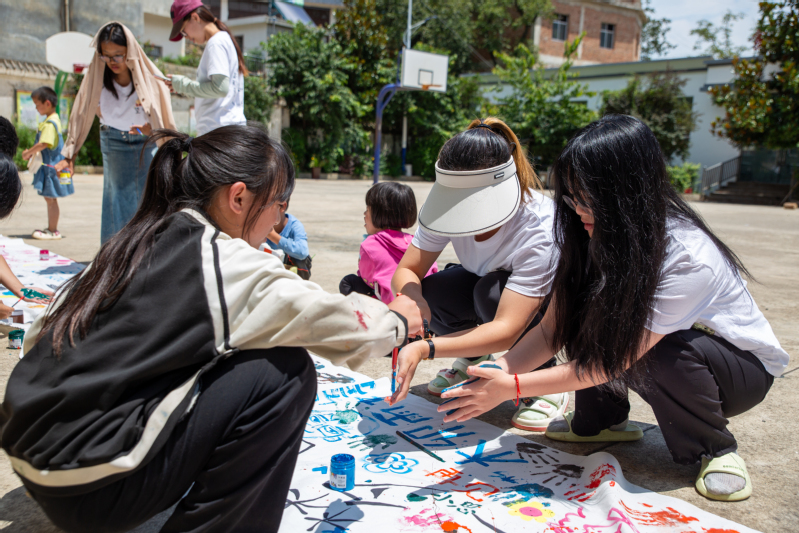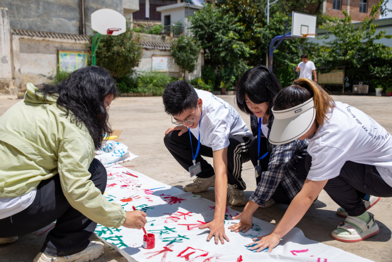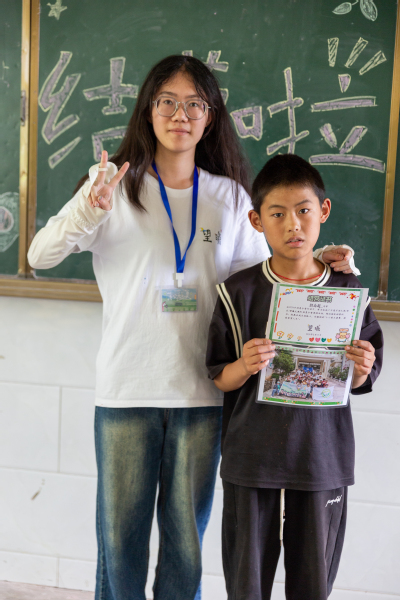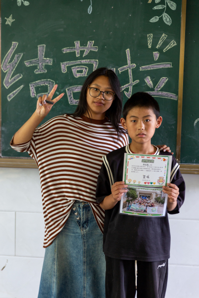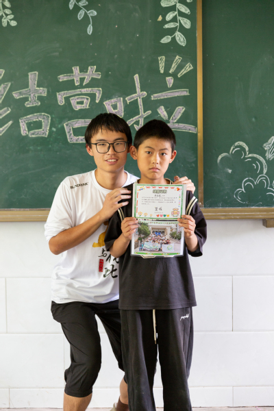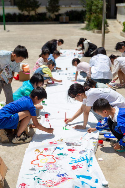在结营仪式上,志愿者与孩子们的最后一次相聚为这个不算大的校园增添了深刻的意义。大家共同表演准备好的才艺,参观志愿者精心布置的作品展览,每个孩子都怀抱着自己抽中的“奖品”,兴高采烈地与伙伴们分享。开营时未完成的画布,在结营之际由志愿者与孩子们共同完成,为此次暑期夏令营活动画上了圆满的句号。