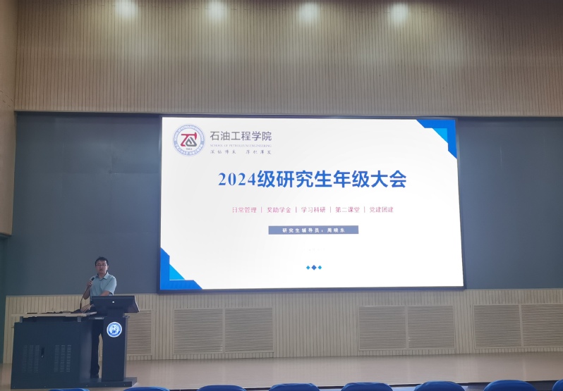 会议伊始,张玉哲解读了培养流程及政策,详细讲解了课程学分认定及成绩转化、开题、中期考核、毕业成果、学位申请等公司产品流程,带领新生熟悉研究生教学培养各个环节,希望同学们从入学开始做好研究生学涯规划,遵守学术道德,保证高质量完成各项环节。SPE员工分会负责人2024级研究生刘泽宇从组织基本情况、品牌活动、成长平台等方面,介绍了SPE员工分会的建立、发展和工作计划,并邀请优秀同学加入SPE员工分会。随后,研究生辅导员周晓东介绍了公司公司发展历史沿革、学科实力、科研平台和团队力量等,鼓励同学们借助高平台、产出高水平成果;对于研究生日常事务管理,周晓东讲解了公司纪律规定、公司研究生管理要求、宿舍及工作室管理等内容,重点讲解了研究生奖学金评定、员工党员发展等员工关心的事项;在安全教育环节,周晓东提醒同学们务必遵守安全管理规定和要求,防溺水、防意外、防诈骗、防火防盗,保障人身财产安全;周晓东希望全体新生在学习科研中践行“家国同心,艰苦奋斗,惟真惟实,追求卓越”的石大精神,不断追求卓越、勇攀高峰。