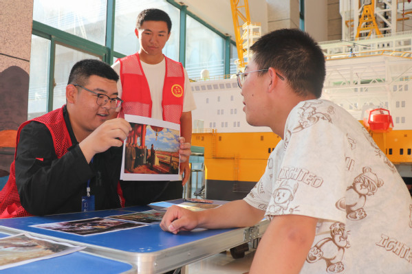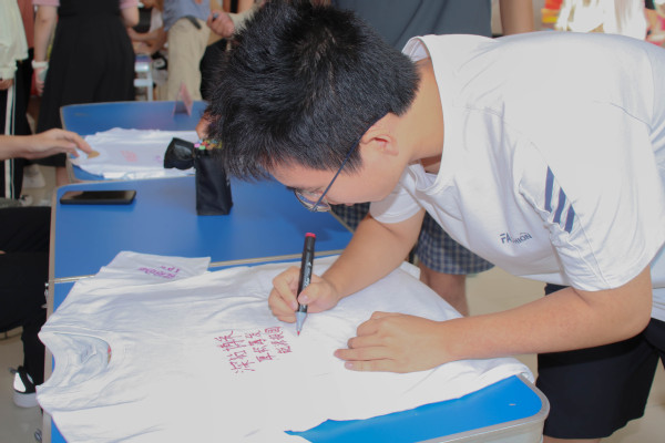 活动伊始,陈泽华和团支部成员们进行书签书写、方斗制作、挂件题字以及文化衫题字等活动。在活动过程中,员工们在书签和文化衫上不仅留下祝贺祖国七十五周年华诞的祝福,还留下对未来自己的寄语。陈泽华也与员工们共同书写诸如“平安喜乐”和“学业顺利”的祝福语,并对员工们的书画作品进行指导和鼓励。