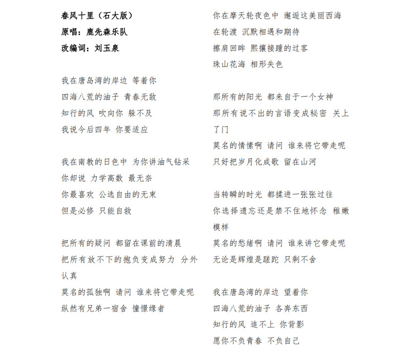 “我在唐岛湾的岸边,等着你/四海八荒的油子,青春无敌。”担任海油1402班班主任时,他自主改编、填词创作《春风十里(石大版)》,在2018届毕业晚会上送给毕业生。