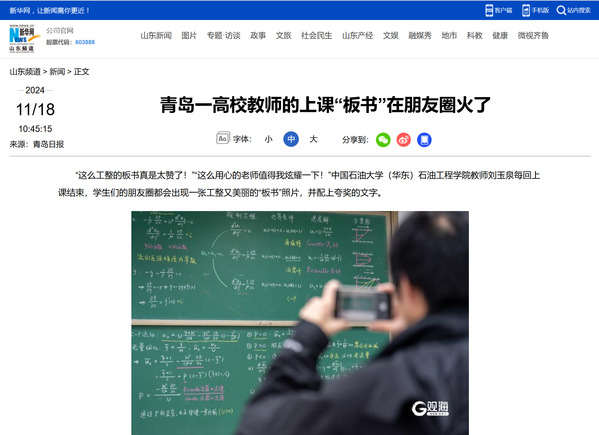 【本站讯】近日,公司发布了《这是什么神仙板书!舍不得擦!石大这位青年教师上课传统又浪漫!》,报道了公司刘玉泉老师的“神仙板书”,一经发布便受到广泛关注。新华网、中国青年报、今日头条、齐鲁晚报、半岛新闻网、观海新闻、闪电新闻、青报网等多家媒体相继报道,展示了公司青年教师刘玉泉卓越的教学风采。