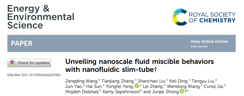 论文“Unveiling nanoscale fluid miscible behaviors with nanofluidic slim-tube”(《纳米细管技术:揭示纳米尺度流体混相行为》)发表在能源领域国际顶级学术期刊 《Energy & Environmental Science》。论文第一作者为2022级博士生王曾定,指导教师为钟俊杰教授。该研究聚焦于致密/页岩油藏注CO2开发中亟需解决的最小混相压精确检测技术难题,创新性地结合微纳流控芯片技术与传统油气行业细管实验方法,提出了一种同时具备驱替效果和相界面可视化检测能力的纳米细管技术。该技术首次实现了对微纳跨尺度孔隙介质中混相压和混相过程的精确测量。研究发现,尽管纳米尺度下CO2与油相的最小混相压低于体相值,但在微纳跨尺度条件下,最小混相压却显著高于体相值。这一重要认识为致密/页岩油藏注CO2开发提供了新的理论认识。