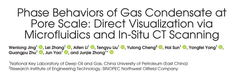 论文“Phase Behaviors of Gas Condensate at Pore Scale: Direct Visualization via Microfluidics and In-Situ CT Scanning”(《基于微流控与在线CT的孔隙尺度凝析气相行为研究》)发表在油气领域国际顶级期刊 《SPE Journal》。论文第一作者为2019级博士生景文龙,指导教师为李爱芬教授和钟俊杰教授。该研究聚焦凝析气藏开发过程中常见的反常凝析现象及露点压力检测问题,创新性地提出了微纳尺度油气相态检测芯片技术。该研究首次通过实验发现,在储层微纳米级孔隙空间中,凝析气的上露点压力显著高于体相值,且随着受限空间尺度的减小,上露点压力呈现升高趋势,指出了现有受限相态理论在预测凝析气露点方面存在的局限,对优化凝析气藏开发策略具有指导意义。