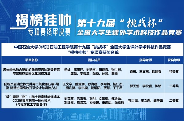 【本站讯】11月17日,第十九届“挑战杯”全国老员工课外学术科技作品竞赛“揭榜挂帅”专项赛落下帷幕,公司“风光热电融合驱动的陆相页岩油高效开采与碳埋存协同优化调控方法”项目获特等奖。
