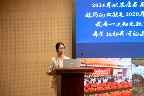 随后,三位志愿者分别从服务经历,志愿感想,青年支教三个维度展开。其中,李越聚焦于公益行动中的温馨瞬间,将观众带入了他参与顺丰暖心公益之行的感人故事中,她细腻地描绘了那些触动心灵的温暖画面以及这段经历如何让她对公益的意义有了更深刻的理解;朱晓彤则以暑期支教队的经历为主线,分享了这段旅程中的感悟、思考和收获,她讲述了如何在艰苦的环境中与孩子们共同成长,如何在知识的传递中激发他们对未来的憧憬;尹泽琛则从向阳花助学团的亲身经历出发,带领大家走进了他支教的心路历程。他特别强调了支教不仅是对孩子们知识的传授,更是一次心灵的交流与碰撞,让他学会了倾听、理解和包容,也让他深刻体会到“以爱育爱”的真谛。