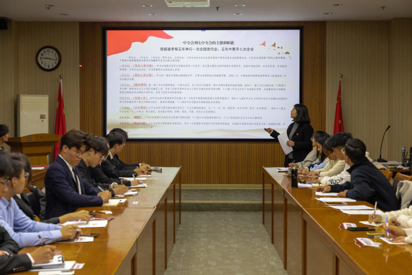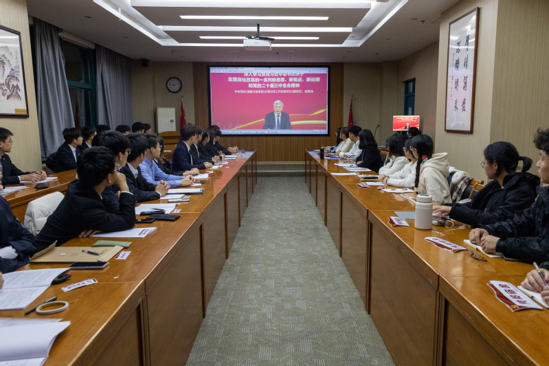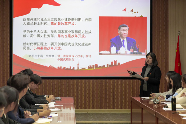 随后,党支部书记王静同志以《绘就改革宏图,再启时代新章》为主题,全面解读了党的二十届三中全会的重大意义与重要决策。她首先以一中全会到七中全会的主题和职能切入,回顾历届三中全会的重要历史意义,结合中国式现代化的鲜明特色与科学内涵,介绍了二十届三中全会召开的历史意义。结合《中共中央关于进一步全面深化改革、推进中国式现代化的决定》的15个部分60条、三大板块详,细解读了《决定》特点和内容,引导同学从“第一板块-怎么看,第二板块-怎么干,第三板块-怎么抓”进行学习,重点把握一个总目标、七个聚焦、六条原则、十四个系统部署等,理解进一步全面深化改革的重大意义和总体要求。