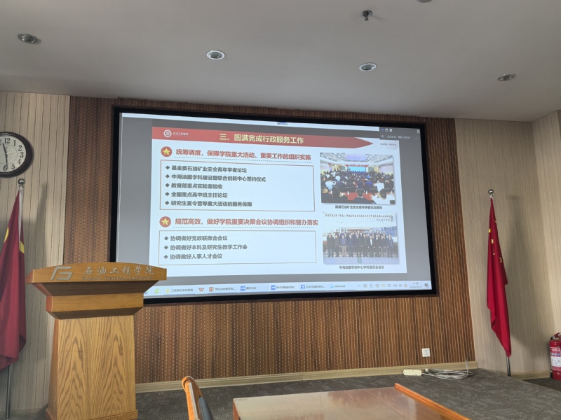 油气井工程研究所、油气开采工程研究所、油气藏工程研究所、油气田化学研究所、海洋油气工程研究所、智能油气田研究所、实验教学中心(公共测试中心)、公司机关等8个单位负责人逐一进行述职。全体参会人员围绕2024年各院属单位负责人履职尽责和担当作为情况、基层党组织建设、人才培养、科学研究、实验室建设、合作交流、工会工作及2025年发展规划等方面进行现场打分评议。