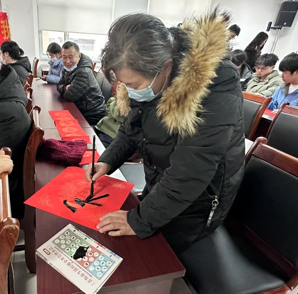 活动伊始,书法展示环节便吸引了众多目光。本研(石)2401团支部贾镇宁以其书法特长,在现场展示了书写“福”字的过程,赢得了居民们的阵阵掌声,增添了节日的喜庆气氛。与此同时,漆书签制作区也异常热闹。支部成员们耐心指导社区的小朋友们大胆地在书签上涂抹色彩和勾勒图案,展现出他们的创意和想象力。最后,支部成员们将提前准备好的礼品分发给参与活动的居民,同时将新春的温暖与欢乐传播到每一位参与活动的居民心间。