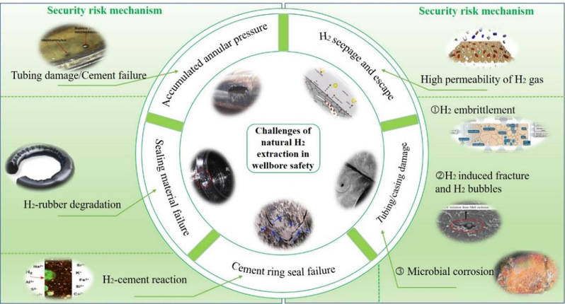 天然氢气作为一种由复杂地质作用生成的可再生氢气,其更低的生产成本和巨大储量被认为是未来能源格局中的重要支柱。世界范围内,美国、欧盟、澳大利亚等多个国家或组织近两年均已将地下的天然氢气勘探开发列为重点前沿性攻关项目。然而,由于低密度、低粘度以及特殊的生物和化学反应属性,天然氢气勘探开发中井筒的安全性将面临严峻挑战。