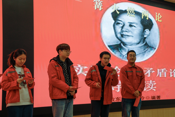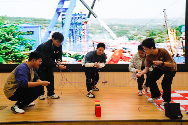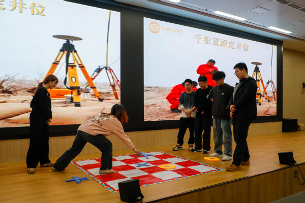 互动环节将活动推向高潮。识字搬山游戏中,同学们通过破解铁人一口井严实作风等历史密码,体会石油先辈边生产边学习的执着;千里荒原定井位环节,两支队伍在战略沙盘上展开博弈,再现地质勘探的智慧较量;化解难关立井架比赛中,青年们用绳索、组件模拟井架搭建,切身感受人拉肩扛的创业艰难。在篝火燃两论情景剧中,6名同学化身余秋里、康世恩等历史人物,通过沉浸式对白再现松基三井定井位的重大抉择,当余秋里挥动《实践论》喊出打破洋框框,走自己工业发展道路时,全场响起经久不息的掌声。