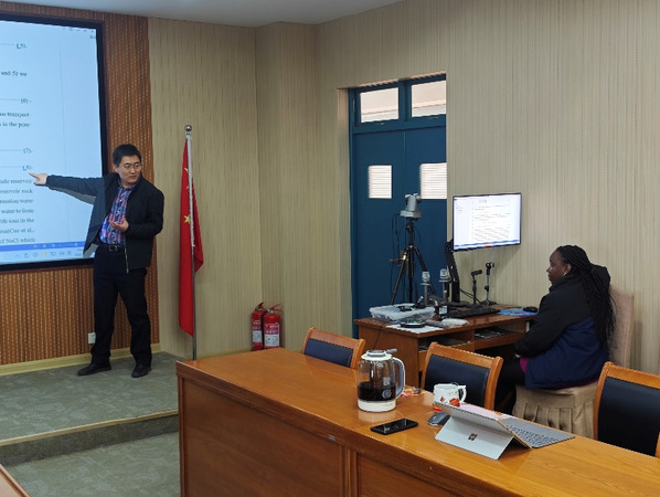 课题组员工在聆听完杨永飞教授的分享后,备受鼓舞,受益匪浅。2023级博士研究生生尚振骁分享了自己近期在地下储氢相关方向的研究进展,2023级坦桑尼亚职工博士MAJID ASIA分享了自己近期在提高深层页岩气藏采收率及二氧化碳封存相关方向的研究进展。杨永飞教授从公式推导、模型设置和结果分析等多方面对两位博士的研究成果进行了细致的分析与指导。杨永飞教授特别表扬了ASIA的科研成长:“从初入课题组的方向迷茫,到熟练运用孔隙网络模型解决实际问题,这既是个人努力的结果,更是团队互助的结晶,希望我们课题组可以一直保持这样的互帮互助,共同进步的友好氛围。”