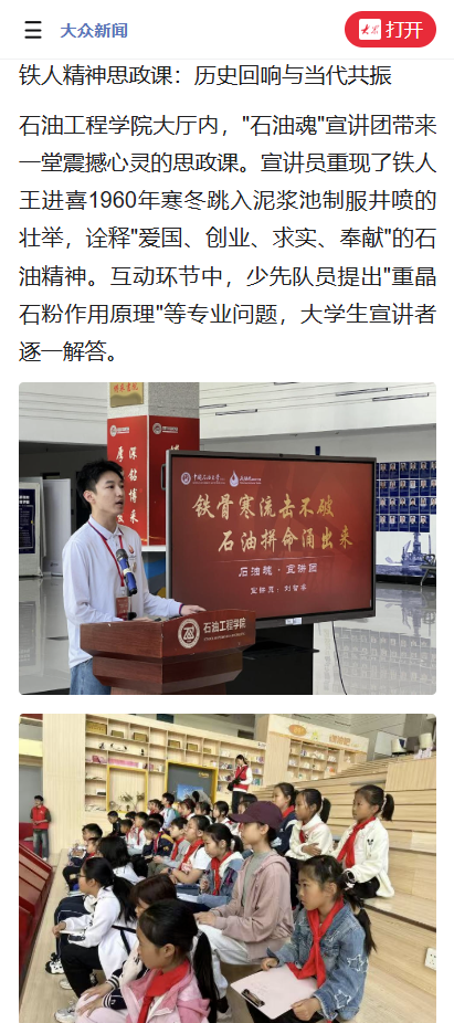 石油魂·宣讲员、石工2022级本科生刘智睿以《铁骨寒流击不破,石油拼命涌出来》为题,向少先队员们讲述了1960年寒冬铁人王进喜以身体搅拌泥浆压井喷,保护了当时国家珍贵油井的故事,通过生动的历史资料和通俗易懂的讲解,在他们心中播下了红色精神的种子,激励少先队员做新时代的“小铁人”。