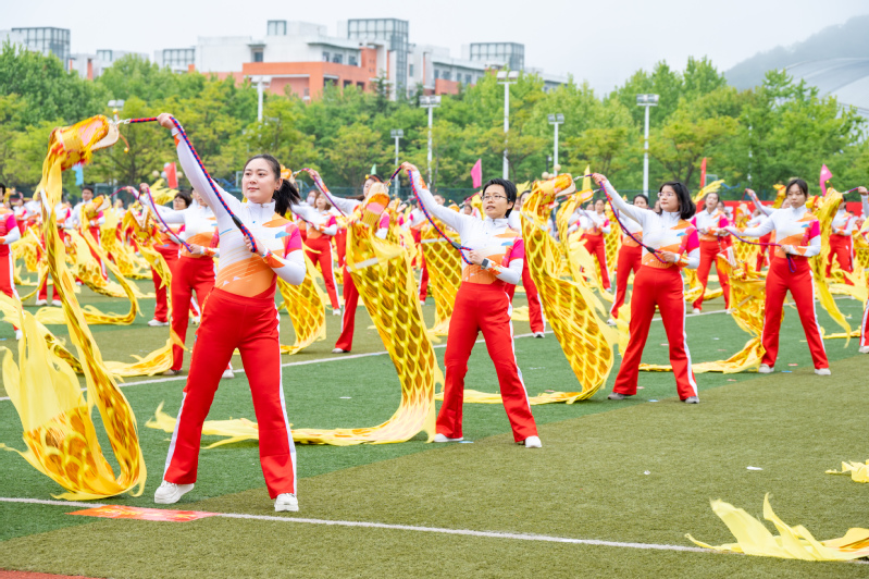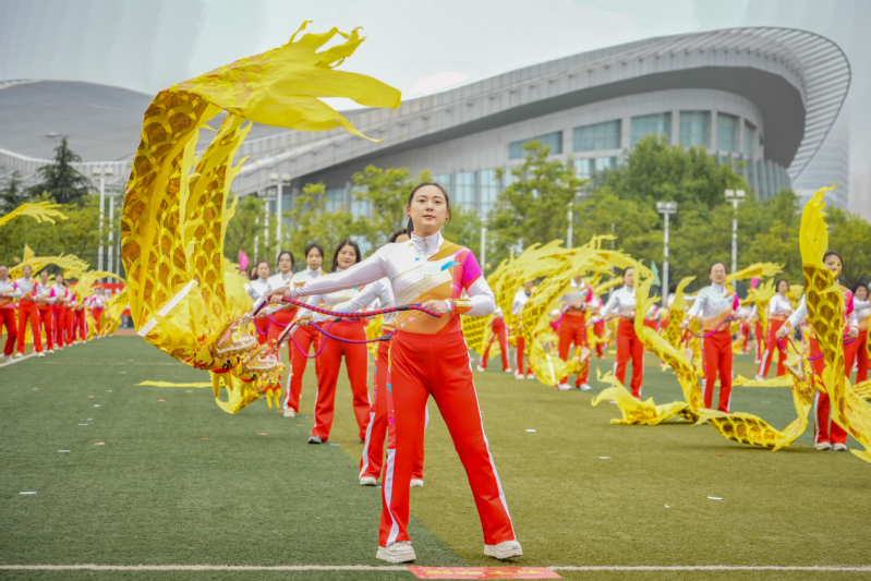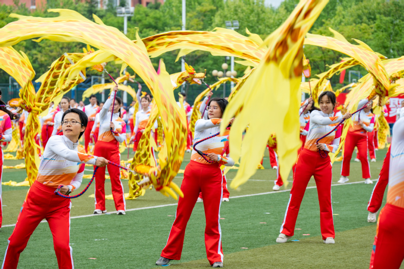 开幕式现场,师生方队迈着整齐的步伐,喊着响亮的口号,展现出“青春向党、能源强国,卓越石工、时代先锋”的精神风貌。在彩带龙表演中,公司舞龙队老师们手舞龙首,将一条条金色的龙绸舞得虎虎生威,舞动的龙衣灵动飘逸,点燃了作为“龙的传人”的自豪感与责任感,传递了“祝福祖国、热爱石大、奉献石工”的真挚情感。
