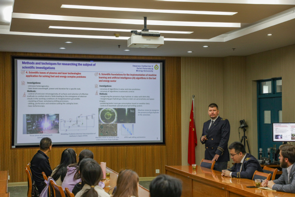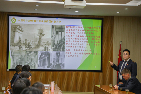 Valentin Morenov介绍了圣彼得堡矿业大学北极科学中心概况,以及中心在天然气水合物、绿色钻井液、泡沫驱油等方面的研究进展;李云鹏介绍了圣彼得堡矿业大学矿业工程中心概况,以及其在缓斜煤层开采领域的研究进展,并作为国际事务联络人,介绍了公司的国际化工作。
