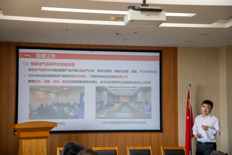 刘玉明领学《求是》杂志刊文“习近平:加快建设教育强国”,强调教育强国建设对科技自立自强的重要支撑作用。各支部书记分别汇报了支部建设情况和技术攻关方向,并进行技术交流。中海油能源发展工程技术公司智能油田研究所党支部书记李昂介绍了海上智能油田建设核心技术攻关方向公司智能油气田研究所党支部书记徐建春介绍支部党建工作和研究所的特色技术,中海油能源发展工程技术公司油藏工程研究所副所长张强介绍了油藏工程领域亟需的技术攻关方向,公司油气藏工程研究所党支部书记李亚军介绍党支部的基本情况和研究所取得的成果。